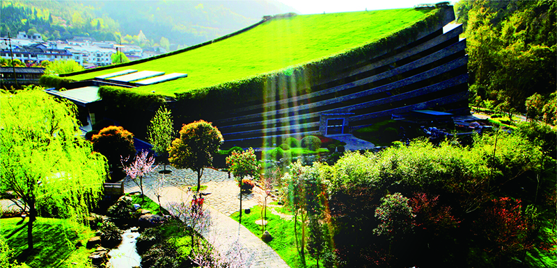 音樂廳與黃龍洞相毗鄰,背靠植被茂密的黃龍洞山體,面朝廣闊田園,南鄰潺潺東流的索溪水,音樂廳屋頂被綠蔭花草覆蓋,綠化面積達(dá)3000平方米,是我國目前最大的單體斜坡綠化屋頂,也是世界上唯一的一家生態(tài)劇院。音樂廳外墻由張家界青石頁巖構(gòu)建成的音符弦線幕墻與自然融合一體,如同一本即將展開等待世人閱讀的張家界文化寶典,又如鑲嵌在張家界的一塊翡翠。