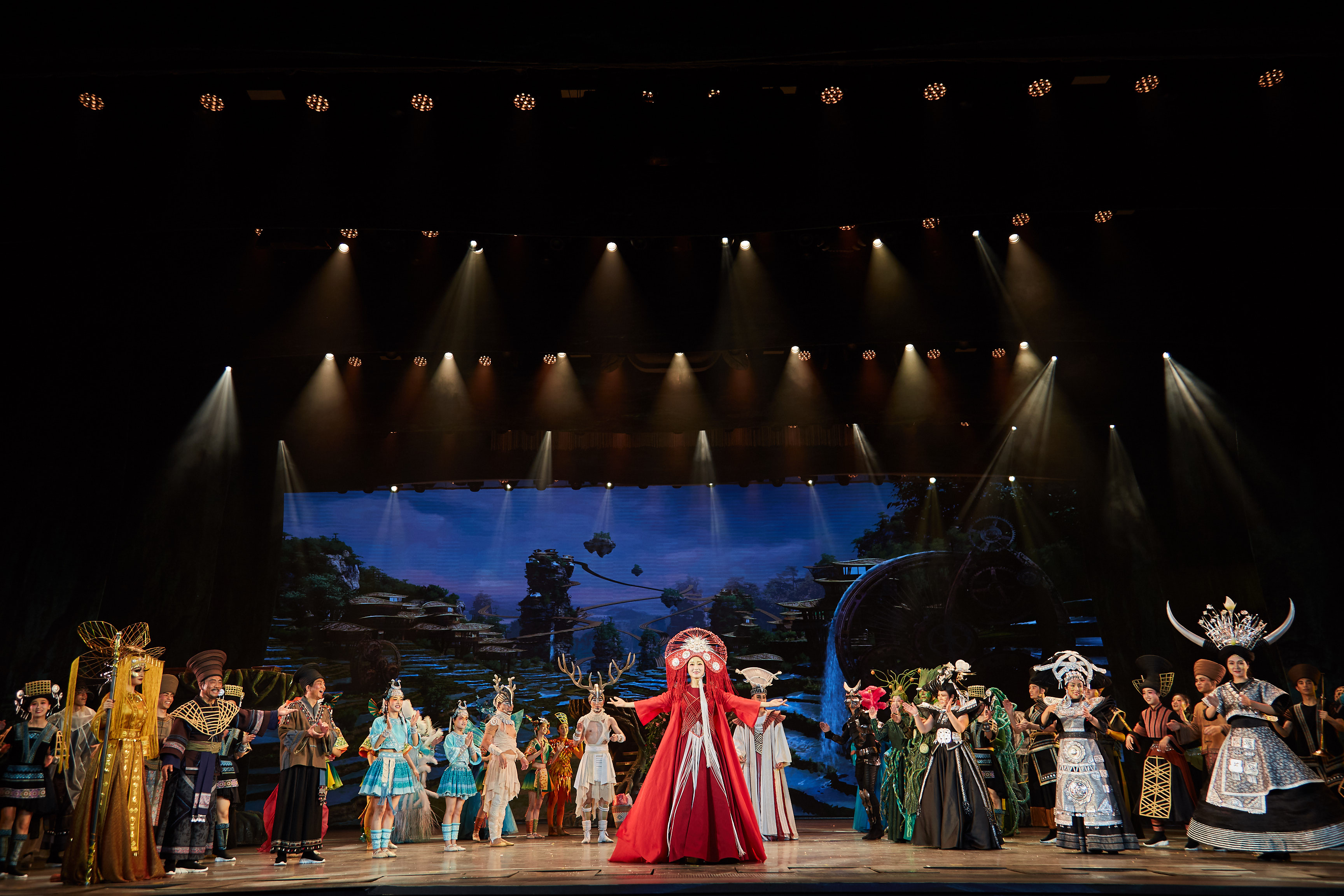 身著婚禮盛裝的青年鹿與“橋“在村民的簇?fù)硐鲁霈F(xiàn)在舞臺(tái)上,村民、觀眾與萬(wàn)物生靈齊聚舞臺(tái),村長(zhǎng)宣布婚禮開始,二位新人一敬天地、二敬父母、三敬觀眾,婚禮禮成,新人為受邀的觀眾斟上傳統(tǒng)的高山流水酒,在喜慶熱鬧的《干一杯》音樂(lè)中,眾人舉杯,村民、生靈與觀眾們開始了狂歡。